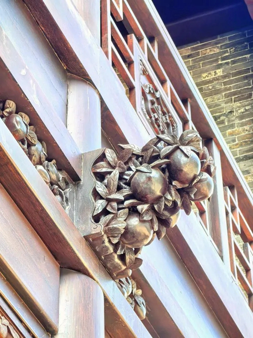 進入北門,首先映入眼簾的是16號樓,其主題為壽桃,主題來源于信陽鄧穎超祖居,祖居繡樓內部裝飾有壽桃石雕,我們便選取此圖案進行創作,在16號樓的墀頭、雀替、卡子花處均有精美的壽桃紋樣。
