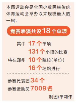 據競賽表演部相關負責人介紹,本屆民族運動會競賽表演共設18個單項,馬上項目比賽已于7月12日至17日在呼和浩特圓滿結束,其他17個單項,131個小項的比賽將在鄭州10個院校(單位)、16個場館進行;參賽代表團34個,參賽運動員7009名,是全國少數民族傳統體育運動會舉辦以來規模最大的一屆。另外,本屆運動會還將突出河南省武術大省的優勢,“少林拳”和“陳氏太極拳”等也將一一呈現。