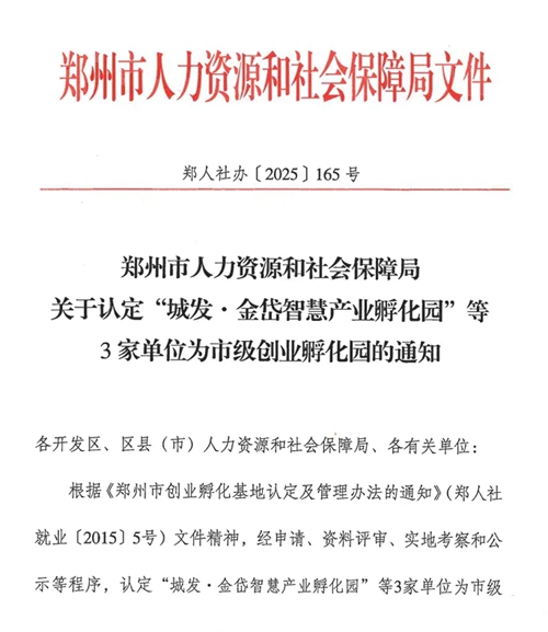 近日,鄭州市人力資源和社會保障局發布關于認定“城發·金岱智慧產業孵化園”等3家單位為市級創業孵化園的通知。根據《鄭州市創業孵化基地及管理辦法的通知》(鄭人社就業〔2015〕5號)文件精神,經申請、資料評審、實地考察和公示等程序,認定“城發·金岱智慧產業孵化園”等3家單位為市級創業孵化園,并頒發鄭州市創業孵化園榮譽牌匾。